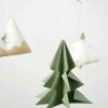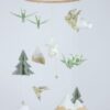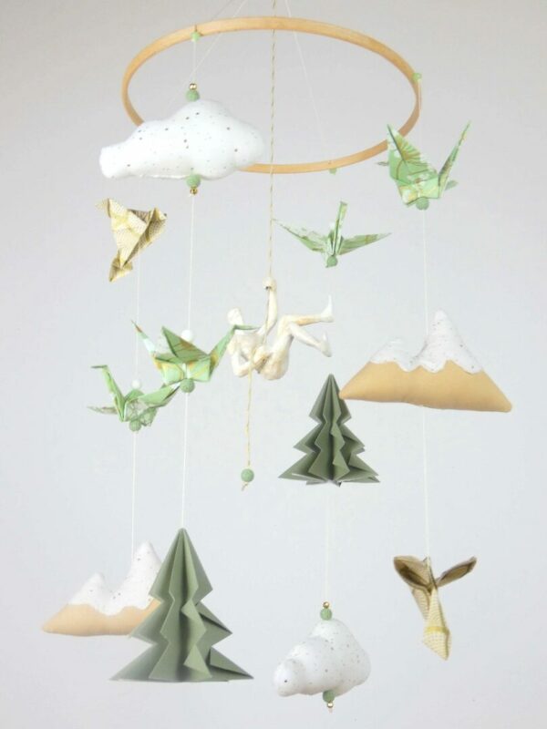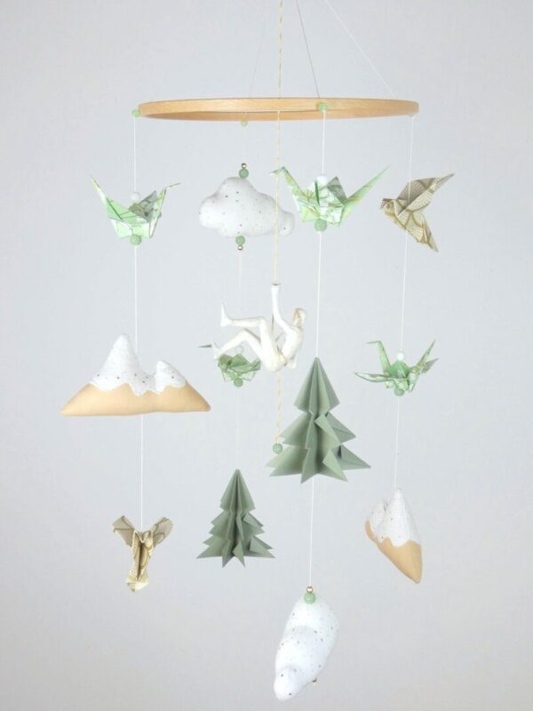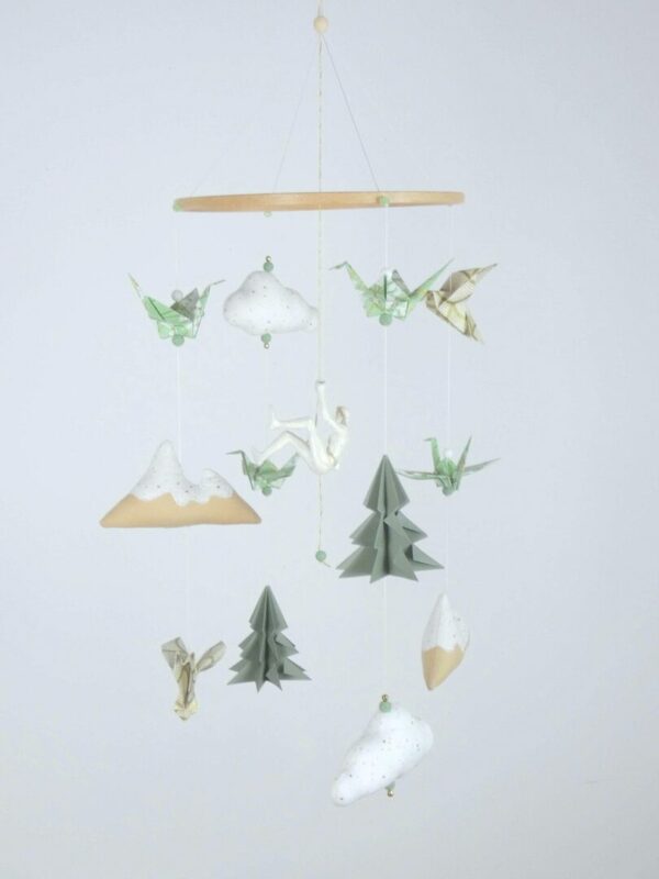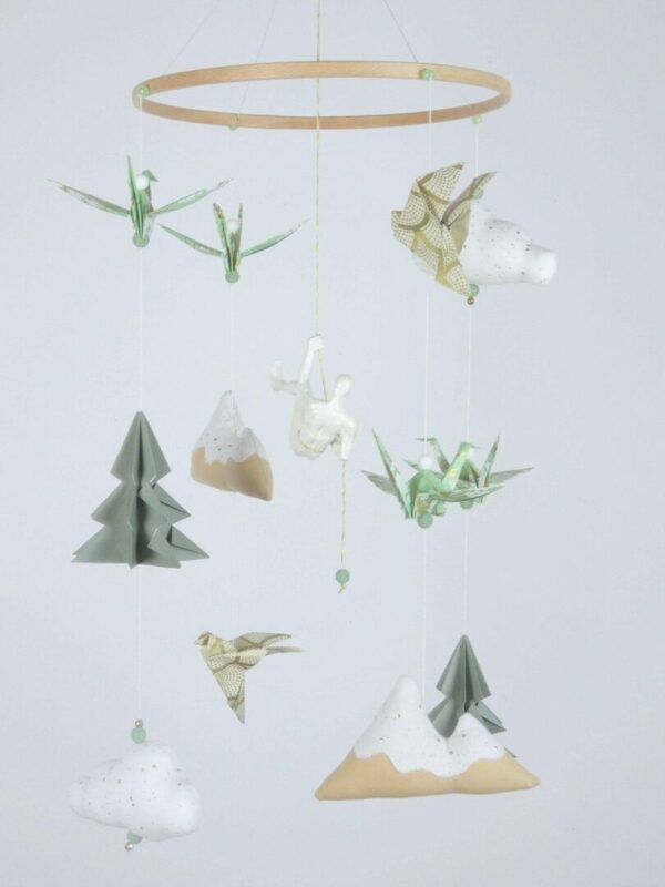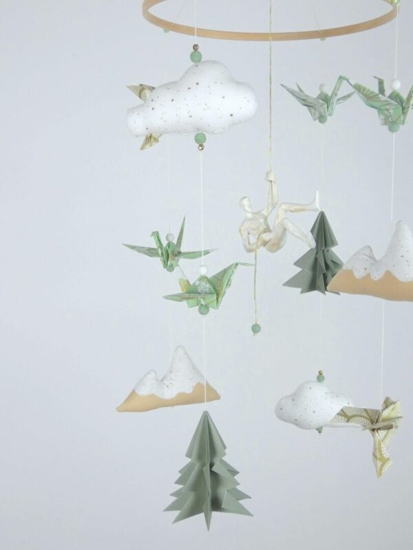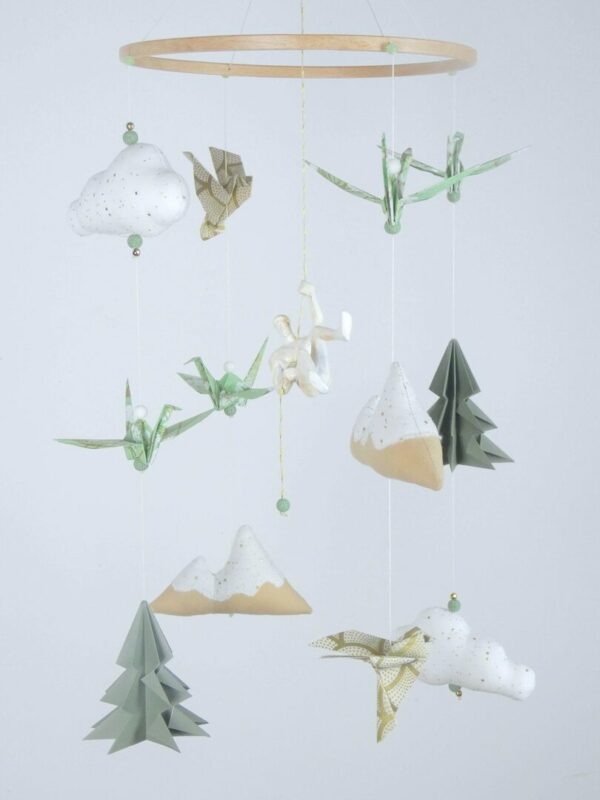 Composition : Cercle en bois, 1 escaladeur peint, 2 nuages en gaze pépites dorées, 2 montagnes en tissus, 2 sapins origamis en papier, 6 origamis oiseaux et perles.