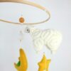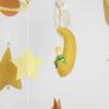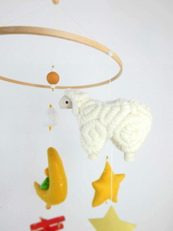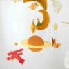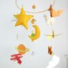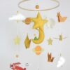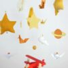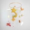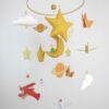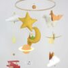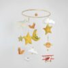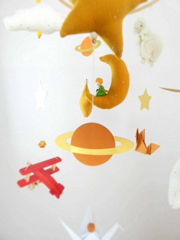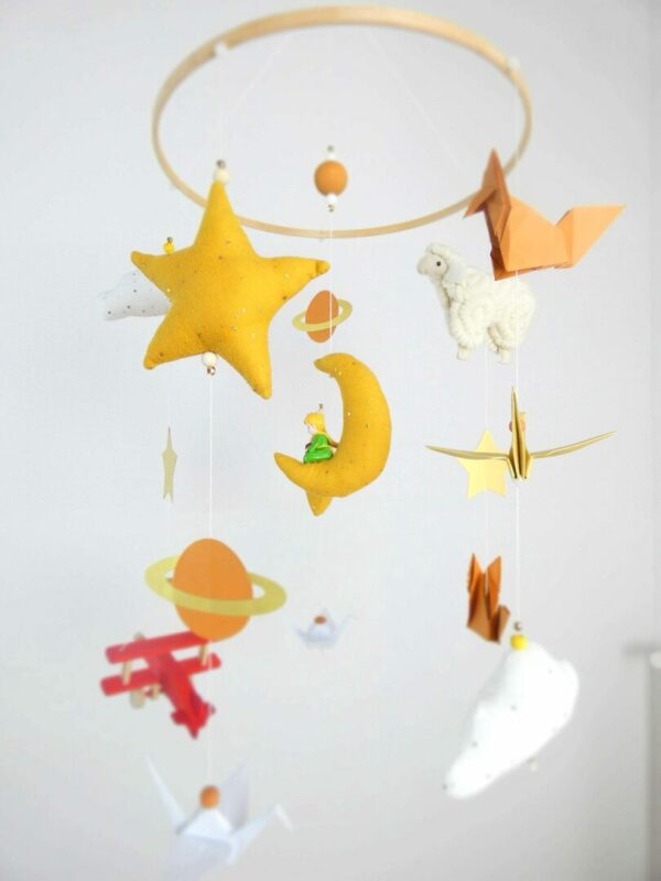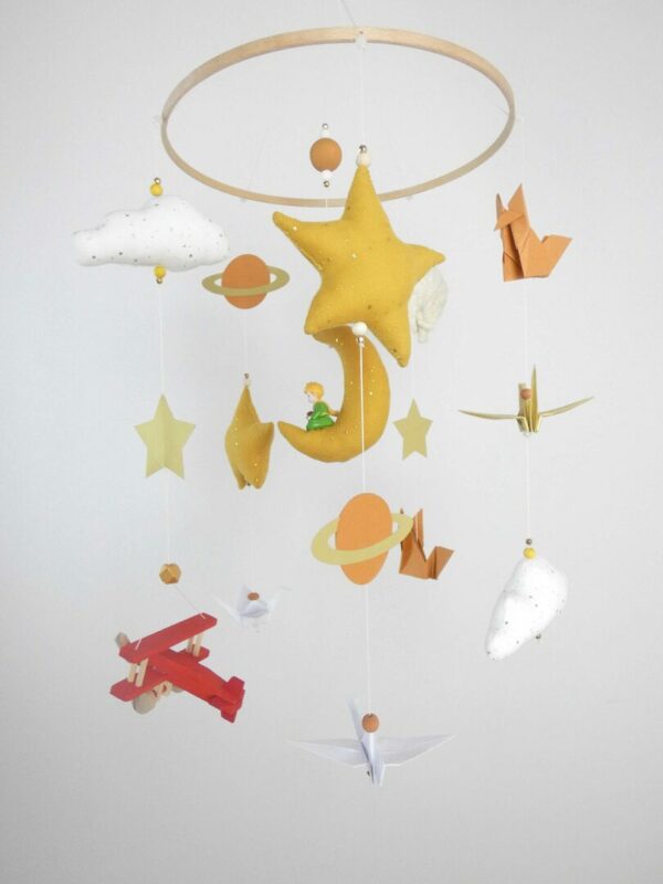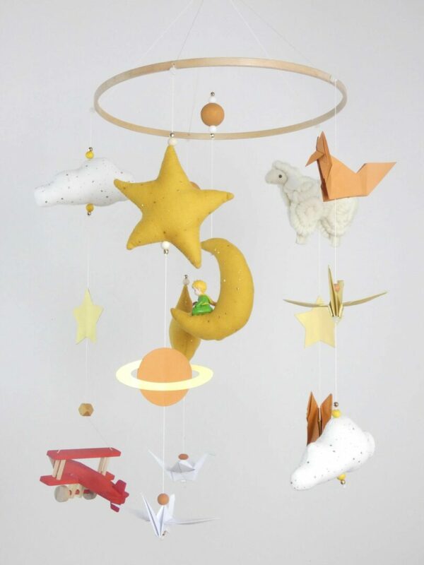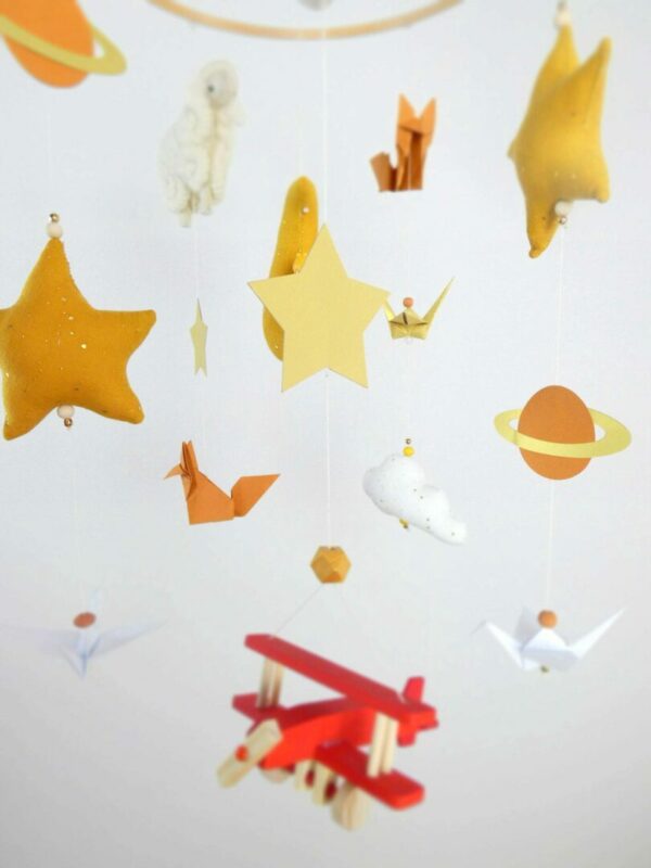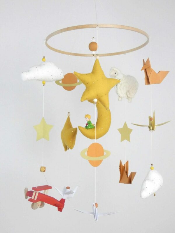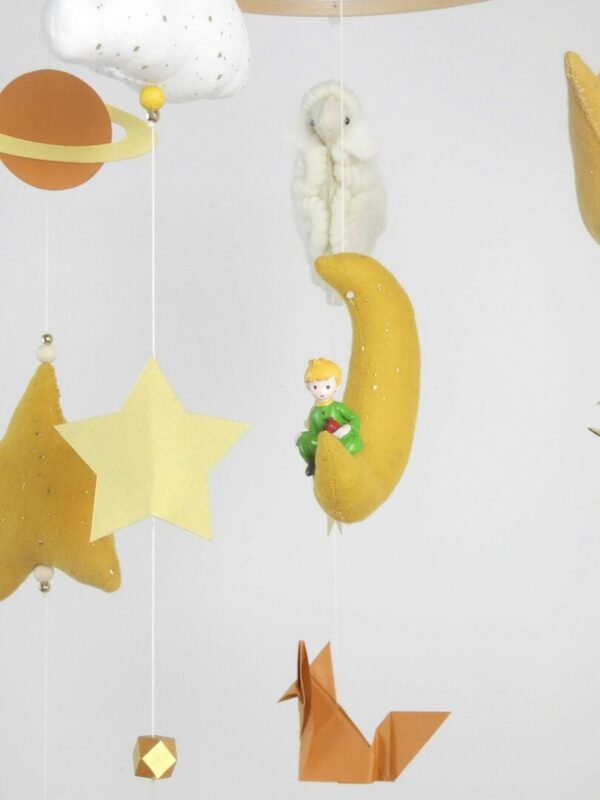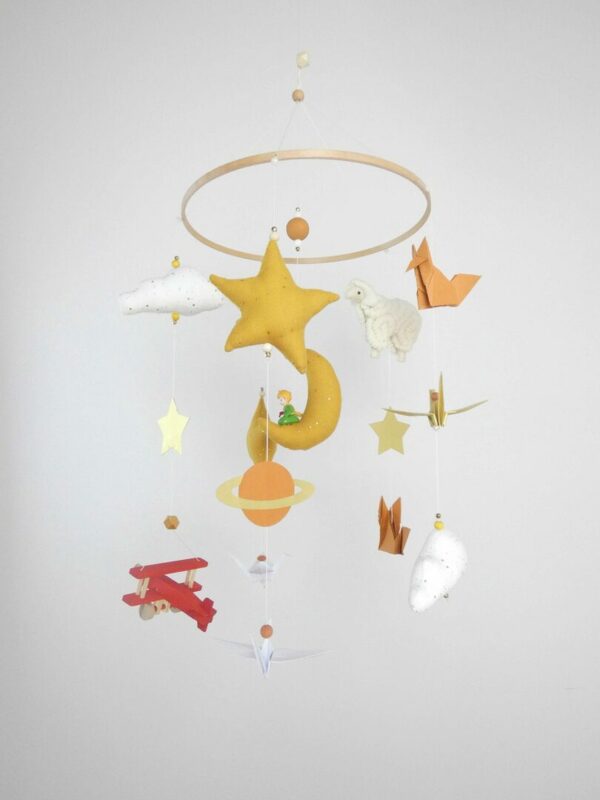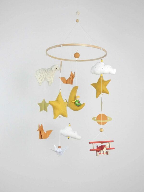 Composition : support en bois rond, 2 nuages en gaze blanc pépites dorées, 1 avion en bois peint, , origamis renards et grues, 2 étoiles en gaze jaune moutarde pépites dorées, une lune avec une figurine le petit prince, 2 planètes en papiers, un mouton en laine feutrée, 2 étoiles en papier doré.