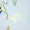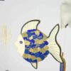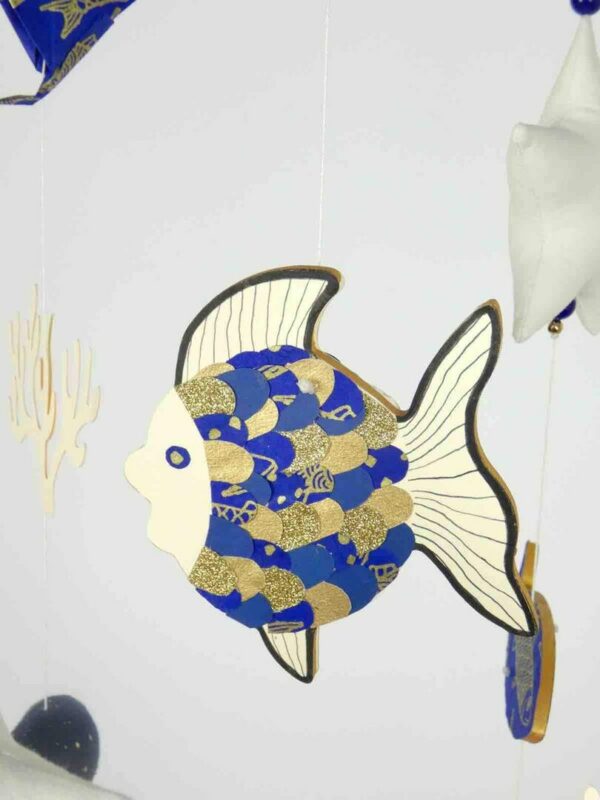 Composition : Cercle en bois, 1 poisson bois avec écailles en papiers, 2 coraux en papier, 2 méduses en gaze pépites dorées, 2 étoiles en tissus, une baleine en bois décorée, un poisson en bois décoré, 4 poissons en origamis et perles.